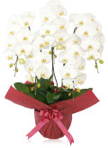 輪数が多く華やかな見栄えから大切なお取引先への贈り物として企業様から多くお選びいただいてます。社長就任祝いや移転祝い、新社屋の落成祝いなどの法人様へ贈るお祝いや冠婚葬祭などフォーマルな場面に最適です。 5本立ちの胡蝶蘭は見栄えも良く、上品な白は絶対に失礼にあたることなく必ず喜ばれます。 立札は、通常のサイズでも問題はありませんが、お花のボリュームに合わせて「木札大」をお選びいただくとより一層目立たせることができます。 より豪華な胡蝶蘭大輪5本立ちデラックス白 ・ 胡蝶蘭大輪7本立ち白もございます。 |