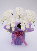 大輪よりも小ぶりで可愛いのが特徴で、個人への贈り物として1番人気があります。花弁のサイズは4~5cm程で、5本立ちは全体の高さが約55cmです。 アマビリスは胡蝶蘭の原種で一般的な大輪胡蝶蘭と比べるとお花は二回り程小さいサイズになります。 コンパクトでありながら、胡蝶蘭の華やかさ、上品さはそのままである為、様々なお祝い事やお悔み、仏事などにご利用いただけます。 大輪と比べ、気軽に贈れるサイズと価格であることから、誕生日や母の日など、個人宛ての贈り物として大変人気があります。 立札を立てることができますので、冠婚葬祭などフォーマルな場面はもちろん、開店祝い等にも最適です。 |