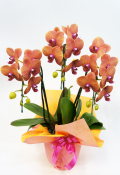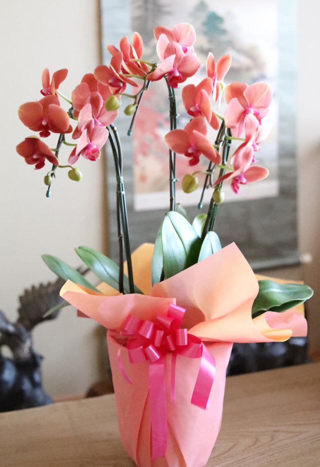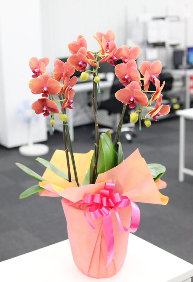 サーフソングは鮮やかなオレンジ色の胡蝶蘭です。大輪よりも小さめの、花弁の大きさが6~9cmのミディ胡蝶蘭にあたります。 白色やピンク色が主な胡蝶蘭の中で、オレンジ色というのはとても貴重で珍しい品種になります。大輪の胡蝶蘭と比べて大きすぎず、高さは60cmほどなので法人用のプレゼントに限らず個人宅へのプレゼントにも最適です。 個人宅でしたら、玄関やリビング・寝室などに置きやすい大きさなので飾る場所に困るという事がありません。 胡蝶蘭に詳しい方へのプレゼントには、無難に白色か色がついているピンクも良いですが、オレンジ色のサーフソングをプレゼントすれば珍しい色に驚き、そして喜ばれる事間違いないでしょう。 花弁が厚くしっかりしているので通常の胡蝶蘭よりも長持ちする事が多いのも特徴です。 他の胡蝶蘭とはひと味違うサーフソングを大切な方へのプレゼントにいかがでしょうか。 |